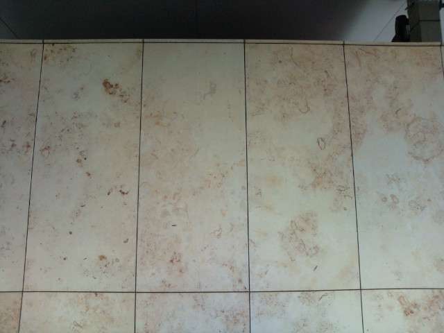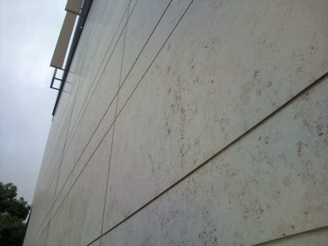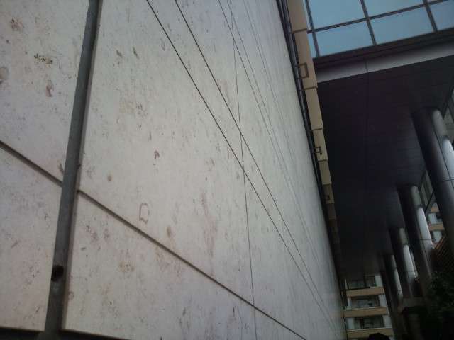ライムストーンを表面保護する場合は、大理石用浸透性吸水防止剤(ADスーパー)を塗布します。ADスーパーは表面から浸透して大理石内部に防水層を形成し、吸水または吸い上げを抑制しますので、石材表面または内部(コート浸透層)の酸化を防止する効果があります。この浸透層は、水蒸気のような細かな分子構造の水を通過させますので、石材内部は徐々に、乾燥状態になります。当該事例では、さらにトップコートであるADセラレジン(防汚コート)を塗布して保護を強化しています。以下の写真はいずれも施工後15年を経過したものです。すでにメンテナンスの時期を迎えてはいますが、しっかりとツヤがあり、保護できている状態です。