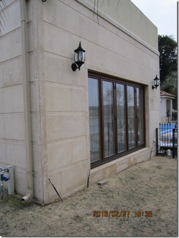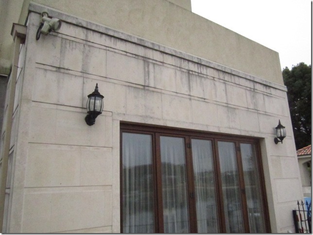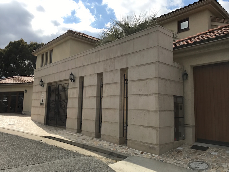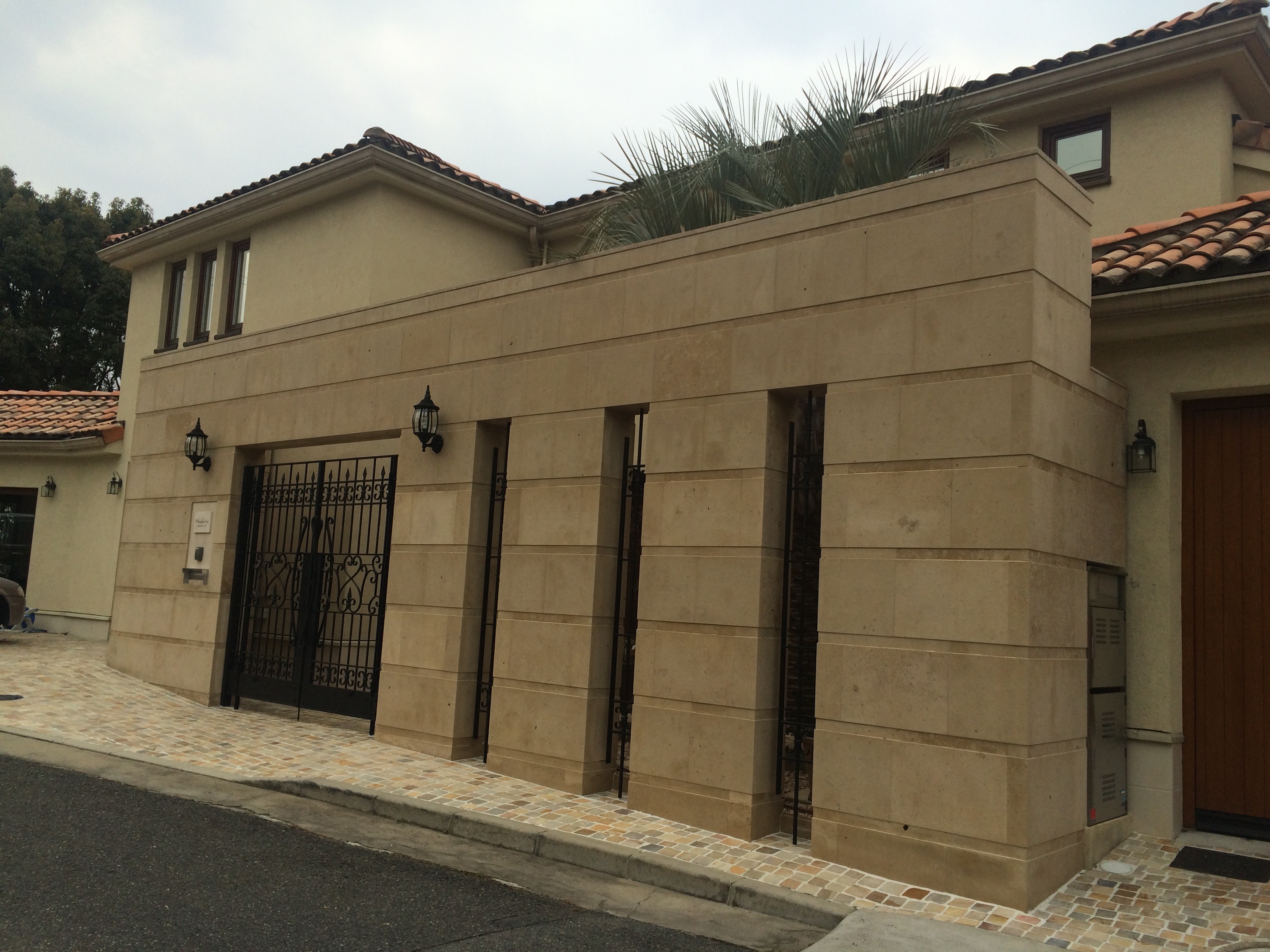 ライムストーンを表面保護する場合は、大理石用浸透性吸水防止剤(ADスーパー)を塗布します。ADスーパーは表面から浸透して大理石内部に防水層を形成し、吸水または吸い上げを抑制しますので、石材表面または内部(コート浸透層)の酸化を防止する効果があります。この浸透層は、水蒸気のような細かな分子構造の水を通過させますので、石材内部は徐々に、乾燥状態になります。当該事例では、さらにトップコートであるADセラレジン(防汚コート)を塗布して保護を強化しています。