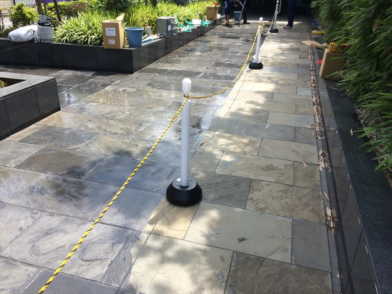 玄昌石(スレート)の場合は、大理石用浸透性吸水防止剤(ADスーパー)を塗布します。ADスーパーは表面から浸透して大理石内部に防水層を形成し、吸水または吸い上げを抑制しますので、石材表面または内部(コート浸透層)の酸化を防止する効果があります。この浸透層は、水蒸気のような細かな分子構造の水を通過させますので、石材内部は徐々に、乾燥状態になります。当該事例では、さらにトップコートであるADセラレジン(防汚コート)を塗布して保護しています。