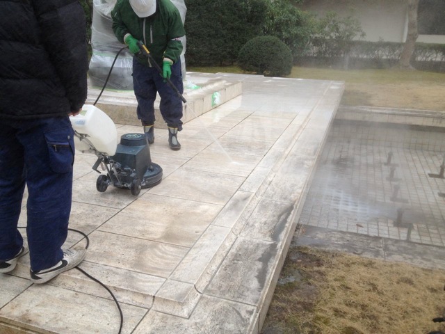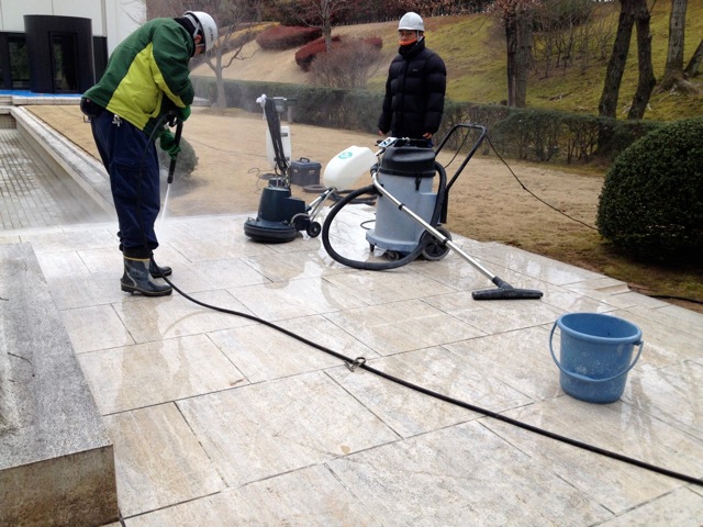 外部床大理石 トラバーチン 再研磨。艶が美しく鮮やかに蘇ります。