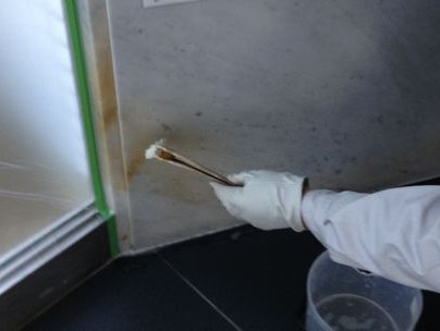 再び黄変を防止するには、大理石用浸透性吸水防止剤(ADスーパー)を塗布します。ADスーパーは表面から浸透して大理石内部に防水層を形成し、吸水または吸い上げを抑制しますので、吸い上げによる黄変を防止する効果があります。この浸透層は、水蒸気のような細かな分子構造の水を通過させますので、石材内部は徐々に、乾燥状態になります。